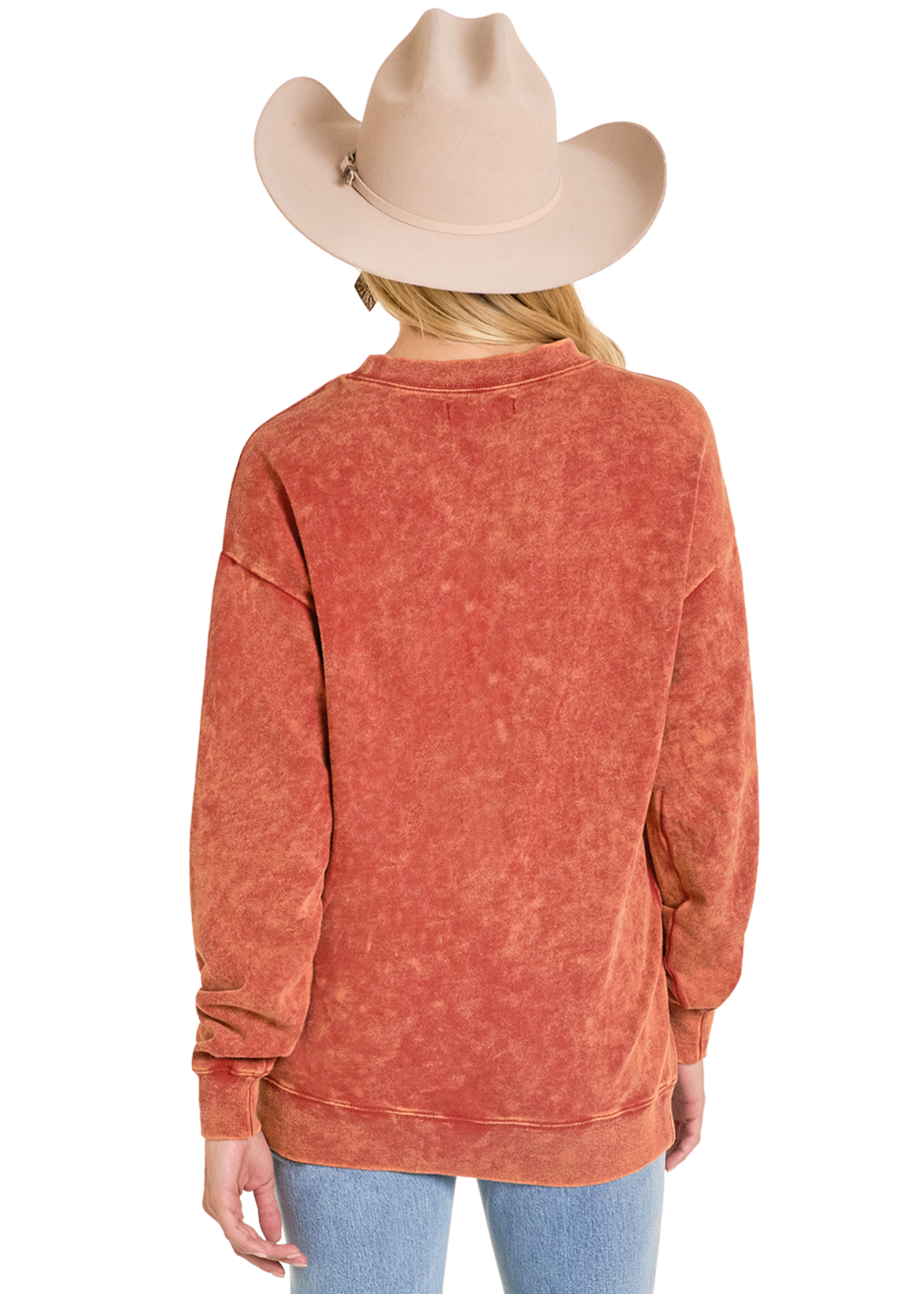 Add a touch of charm to your wardrobe with our Rodeo City Distressed Graphic Pullover. This relaxed-fit pullover showcases a long bronc rider graphic on an orange mineral wash fabric. Made from 100% cotton, it's ideal for those who love a relaxed, stylish look.