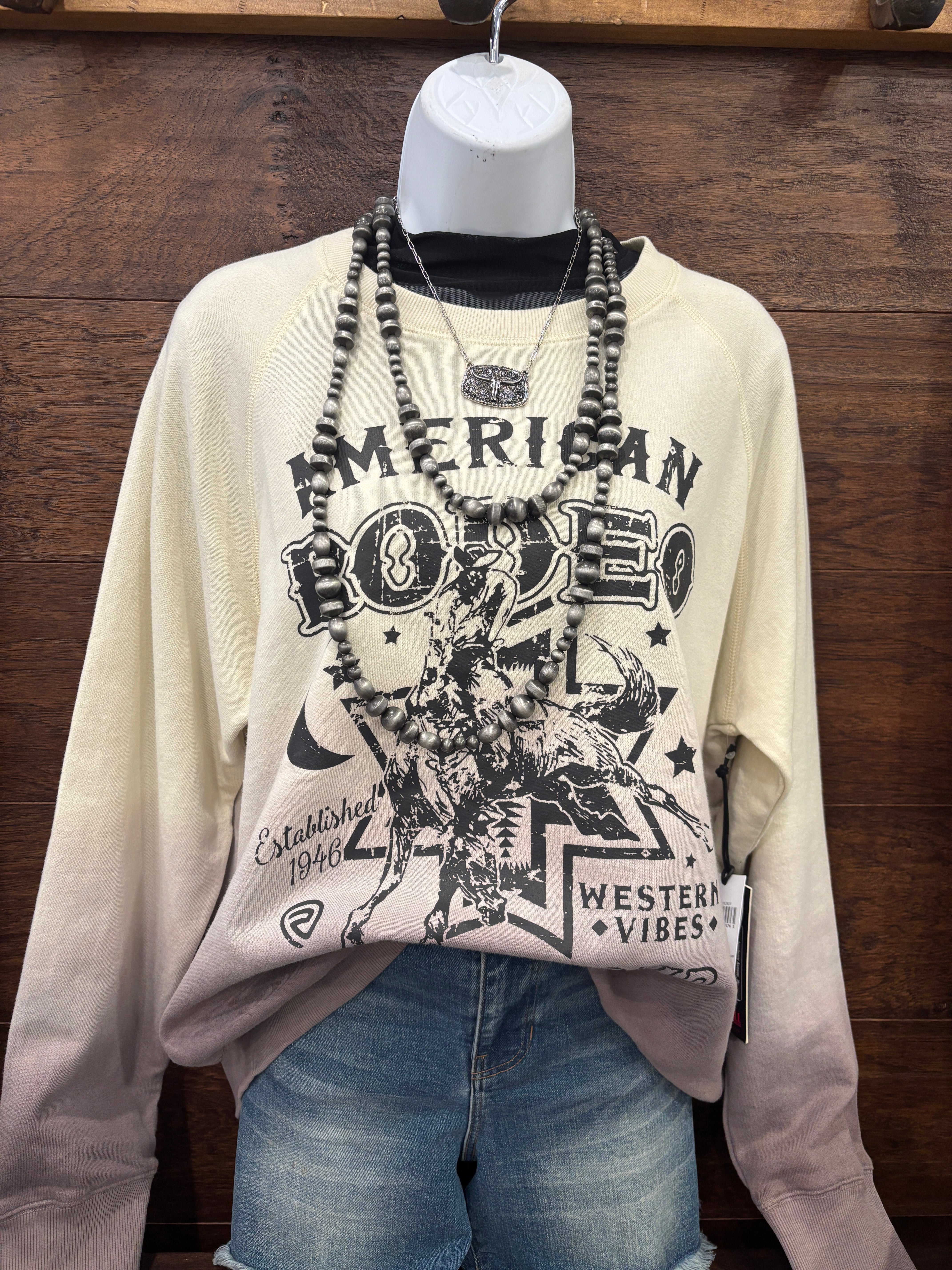 AMERICAN RODEO SWEATSHIRT. This cozy sweatshirt is perfect for any rodeo enthusiast or anyone who loves a comfortable, stylish look. Made with a soft, durable fabric, it features a classic design that's easy to pair with jeans, leggings, or skirts. Available in a range of sizes, this sweatshirt is a must-have addition to any wardrobe.